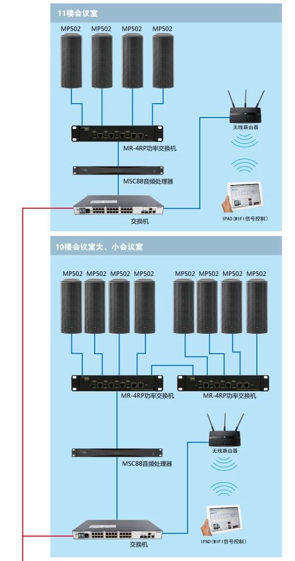在此次項目設計中,工程商選用了Mission Pro MP全頻系列中的MP-502作為會議室和多功能廳的主擴揚聲器。MP-502為雙5.5寸有源壁掛音箱,內置Dante與D類功放模塊,通過一根網線進入系統MR-4RP功率交換機;MR-4RP通過網線連接MSC-88音頻處理器,最終通過網線連接主交換機,無需輸出模擬信號,通過Dante網絡傳輸協議進行數據處理。整座大廈采用了整合性極高的多功能分布式云控制系統。