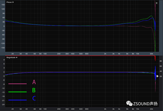 由圖可見三款產品的頻率響應都能達到要求,幅頻響應在±0.5dB之內,相頻響應都在±30°之內,這其中還有一定的測量誤差。而三者之間的幅頻響應差別還是顯而易見的,B型號的頻率響應明顯比A和C差一些。