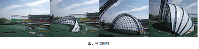 室外表演或實景演出往往需要超大的舞臺設備,提供與演出環境相適應的大型表演舞臺,并根據演出內容進行實時轉換。常規的平移、升降已無法滿足需求,需要平移、旋轉、傾斜、升降等運動形式的組合,實現大型舞臺場景的變化。如云南“希夷之大理”的旋轉升降組合穹頂翻轉技術的應用。其主舞臺由旋轉相切的圓形組成,天棚穹頂是舞臺整體眼睛創意的眼珠,翻轉升起后可以作為投影幕使用。其中,五瓣穹頂既要相互分離,還要互相支持依靠,保證輕薄球面結構的整體穩定和變形控制,采用主次骨架結構、同軸旋轉、液壓頂推、滾動支撐、分離掛鉤等方法,實現穹頂翻轉,如圖5所示。采用同心軌道、多點浮動鏈輪驅動、虛擬圓心定位、電纜滑車供電、液壓系統隨動等方式,實現大型圓弧轉臺的360°旋轉;采用自主液壓同步控制軟件,有效解決了不同液壓驅動設備的同步問題,穩態同步控制精度小于5 mm。