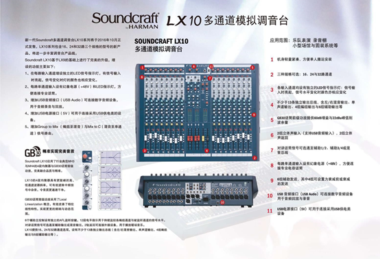 新一代的LX10沿用了已成為行業典范的Soundcraft MH3與MH4的4段參量均衡器和GB30話放;且在上一代的基礎上增加了5種新的實用功能,輸入通道每通道獨立隨信號強弱變化而改變顏色顯示的LED指示燈、輸入通道單獨+48V幻象電源控制、內置USB音頻接口聲卡直接連接你的數字音頻工作站進行音頻錄音與回放、增設多功能USB 5V電源接口、支持將Group 編組信號發送至主輸出混音母線MIX和主輸出混音母線MIX信號發送至C單通道母線兩種信號路由方式式。這些都極大的提高了我們實際應用是的便捷性。
