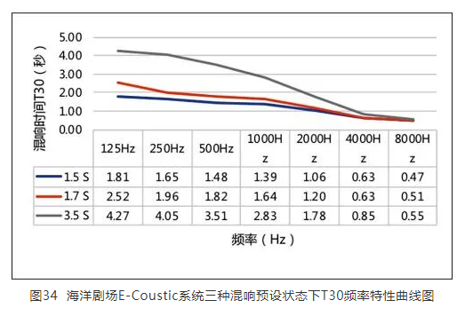 本項目總共進行了兩次調(diào)試,第一次調(diào)試完成后,客戶在使用過程中感覺混響時間不足以滿足廳堂所有的應(yīng)用場景,故又根據(jù)客戶的需求進行了第二次調(diào)試,增長了混響時間。除了廳堂自身的固有聲學(xué)條件外,經(jīng)歷了兩次調(diào)試的E-Coustic系統(tǒng)共設(shè)置了10個混響時間預(yù)設(shè)模式,分別為1.5 s、1.7 s、1.9 s、2.2 s、2.6 s、2.9 s、3.2 s、3.5 s、4 s和6 s,同時,還設(shè)置了一個對廳堂本身聲學(xué)問題進行一定程度修復(fù)的語音舒適模式。現(xiàn)場調(diào)試完成后選取了1.5 s、1.7 s及3.5 s預(yù)設(shè)進行了實地測量,T30的測量結(jié)果如圖34所示。此外,系統(tǒng)本身對初始時間間隙、早期反射聲、混響能量等聲學(xué)參數(shù)均可單獨調(diào)節(jié),這也極大地豐富了系統(tǒng)的綜合調(diào)控能力,使整個聲學(xué)空間的真實感和內(nèi)部參數(shù)間的適配度得以有效提升。