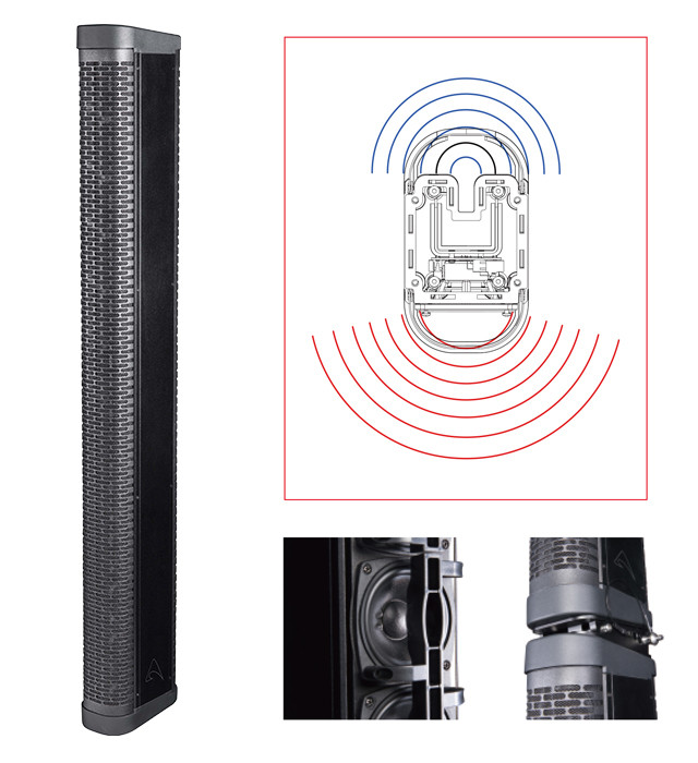 該產品由12個3.5"釹磁喇叭單元按垂直方向排成線陣組成,每一個喇叭都由前衍射波導驅動加載,方便水平范圍的廣泛擴散,可以很靈活地應用在不同的場合。