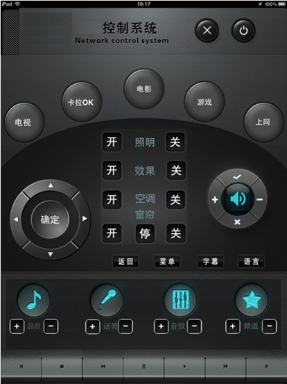 它將帶您進(jìn)入真實(shí)7.1聲道的私人高清影院世界;它會(huì)幫您調(diào)暗燈光、關(guān)閉效果彩燈、音視頻切換到藍(lán)光播放機(jī)、擴(kuò)聲系統(tǒng)調(diào)整到最佳電影效果、、、您一樣可以在IPAD上輕松自如的管理音量大小及靜音。