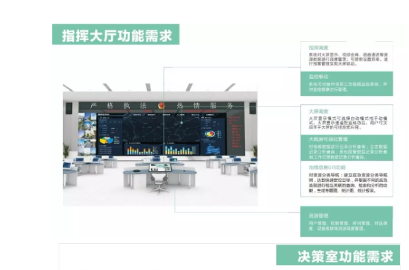 綜合指揮中心是一個集預案、視頻、圖片、語音、地理位置等信息為一體,以信息網絡為基礎,各系統有機互動為特點的城市信息化基礎設施。通過集成的視頻監控系統、GIS信息系統、網絡通訊系統和應急聯動系統將公安、消防、衛生、交通等應急指揮與調度集成在一個管理體系中,通過共享指揮平臺和信息平臺,實現集中接警、及時研判、快速響應、統一指揮和聯合行動。