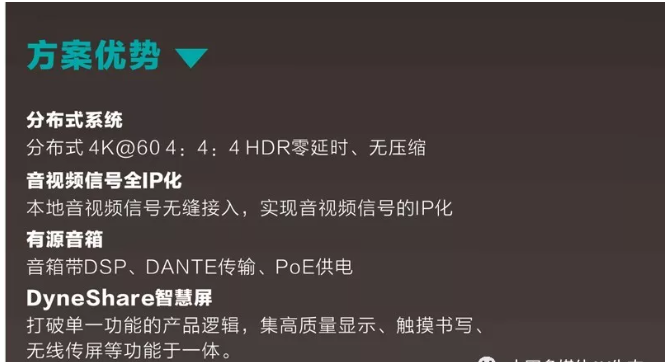 會議室是信息交互的平臺,實現信息的傳遞主要是兩種方式,就是視和聽。視覺的內容主要是圖像和文字資料,聽覺的內容則是聲音。DANACOID通過DyneNet和DynePro系列打造音視頻全IP化系統。通過網線完成音視頻信號的傳輸、管理和控制,打造最佳的會議室視聽效果。