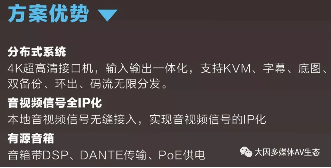 現代型會議室最基本的用途是討論會議、視頻會議、工作匯報等。因此需要滿足會議語言類的擴聲和視頻顯示的功能。同時如果作為分會場使用時需要滿足把主會場的音視頻信號實時的發送到會議室來。