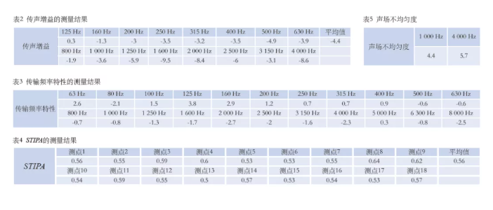 施工完畢后,進行了現(xiàn)場實測,測點如圖10所示。經(jīng)現(xiàn)場測試,擴聲系統(tǒng)聲壓級可基本達到設(shè)計值,其他測量結(jié)果見圖11、表2—表4。測試結(jié)果反映,該項目達到設(shè)計目標及行業(yè)相關(guān)標準指標。