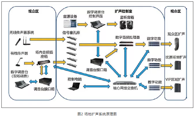 擴聲系統(tǒng)的總體改造方案,系統(tǒng)的音頻控制、傳輸通過Dante網(wǎng)絡(luò)構(gòu)建數(shù)字加模擬的混合網(wǎng),場館內(nèi)所有音頻信號均匯聚到音頻控制機房進行分發(fā)。數(shù)字調(diào)音臺同樣采用一主一備,主調(diào)音臺可搬至場內(nèi)進行現(xiàn)場調(diào)控,并在主席臺區(qū)預(yù)留音頻接口箱,可接入有線傳聲器、無線傳聲器系統(tǒng)。系統(tǒng)使用時,需要根據(jù)不同賽事的使用場景對數(shù)字調(diào)音臺以及功率放大器進行預(yù)設(shè)。系統(tǒng)基本框架如圖2所示。
