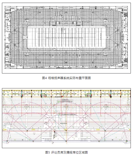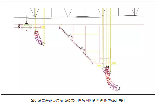 比賽場地上空設(shè)置有巨大的投影幕布,面積與比賽場地近乎一樣。為此,對場地擴聲系統(tǒng)提出了多種方案。其中,一種方案是調(diào)整揚聲器的覆蓋角度,以避免因投影幕布反射形成的回聲,但受整體環(huán)境所限,難以實現(xiàn)。另一種方案是考慮采用透聲幕布,揚聲器吊掛在透聲幕布上方,但會影響投影效果。在實施中,最初采用透聲幕布,經(jīng)過多方溝通,方案幾經(jīng)調(diào)整,在安裝位置與投影幕布之間取得平衡,最終采取分段式幕布加揚聲器吊掛調(diào)整,將揚聲器吊掛與各幕布之間,并選用8只小尺寸、高聲壓的點聲源揚聲器P12,既不會影響投影效果,也可滿足聲場覆蓋,達到設(shè)計指標。