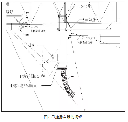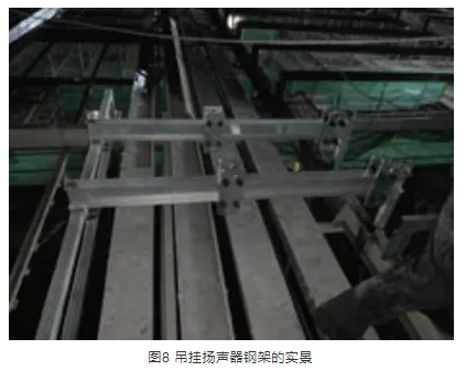 在揚聲器系統(tǒng)吊掛過程中,由于首都體育館保留了原有大頂球型網(wǎng)架結(jié)構(gòu)、馬道,在球型網(wǎng)架的結(jié)構(gòu)下還有鋁板造型結(jié)構(gòu)以及龍骨,而揚聲器系統(tǒng)的吊掛點位于大廳頂層鋁板之上,需要穿過結(jié)構(gòu)下懸桿、鋁板和鋁板固定龍骨層,避開燈光線路以及馬道,并且每一組線陣列揚聲器的安裝位置不相同,需要精確的定位,以滿足現(xiàn)場覆蓋的范圍及角度。基于這種情況,在進行了實地勘察測量后,經(jīng)各方討論,最后選擇了單獨設(shè)計安裝鋼結(jié)構(gòu)吊點的吊掛方式。根據(jù)現(xiàn)場不同的位置,定制吊掛揚聲器的鋼架,如圖7、圖8、圖9所示,吊掛高度可以在鋼架上調(diào)整。這一結(jié)構(gòu)不僅可以避開場地照明光路等,還可以應(yīng)對施工過程中馬道等一些設(shè)施的更改。