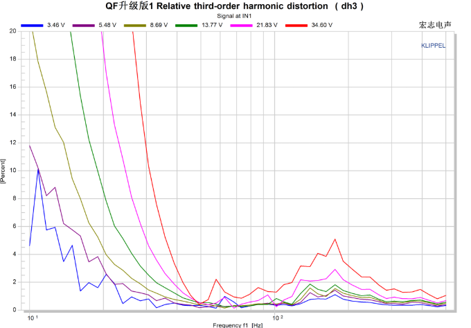 上圖是一個喇叭的輸入電壓跟失真的關系圖,不同顏色的線代表不同電壓,可以看到,隨著輸入電壓的增大,失真跟著增加。