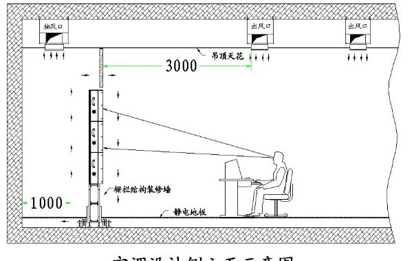 2) 整個(gè)大廳的燈按平行于屏幕方向分組進(jìn)行控制,不要選用較強(qiáng)光的光源,燈光的布置原則是:使工作區(qū)有足夠燈光強(qiáng)度,但對(duì)屏幕又不會(huì)產(chǎn)生明顯的影響。