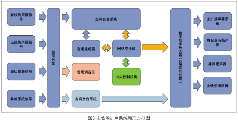 擴聲系統中自傳聲器接收聲信號轉換成電信號開始,到揚聲器將電信號轉換成聲信號,進行系統設計時應盡量減少系統內電信號的A/D、D/A的轉換。另外,對于系統中主備切換設計,應盡量避免使用備系統部分。