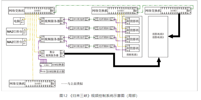 通常聲像光機是音響、燈光、視頻和機械等各專業系統各自采用不同的控制技術,分別配置獨立的控制系統,通過演出場所配備的內部通訊設備(簡稱“內通”)或對講機,保持相互間的協調配合。隨著技術的進步,特別是在文旅演藝領域中大量出現光影秀和主題劇場、文旅實景等被稱為“聲光電表演”“光影秀”“聲光影視表演”的演出,通常都是聲、光、影視和特效機械緊密結合的模式,從而使表演控制(show control)這一技術得以快速發展。國內對這沒有統一的術語(有稱“演出控制”[12]),也鮮有廣泛深入的研究及探討。