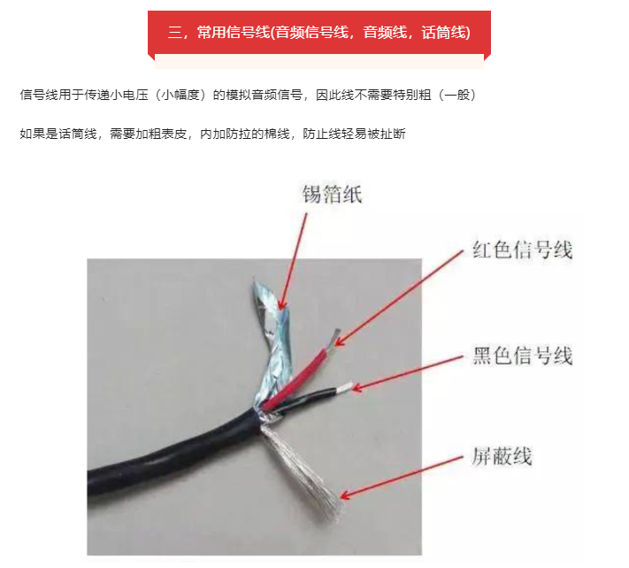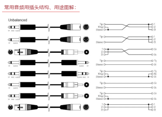 非平衡式連接和信號傳輸:采用兩端連接方式,信號線由內(nèi)部的一根芯線及屏蔽層組成,音頻信號的傳輸由芯線和屏蔽層負責(zé),芯線連接信號正極,而屏蔽層連接信號負極。用于非平衡式傳輸?shù)慕硬寮猩徎ú孱^和大二芯插頭兩種。