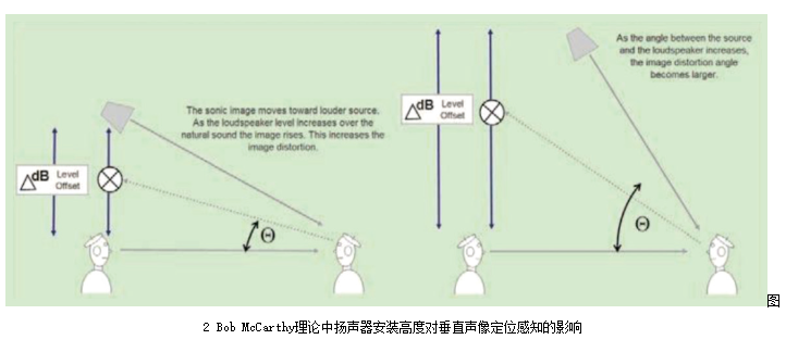 任何解決方案都存在一定的局限性。這些局限性主要來(lái)自于劇場(chǎng)的尺寸、舞臺(tái)的結(jié)構(gòu)、觀眾席座位的分布以及劇場(chǎng)的聲學(xué)環(huán)境等要素。使用中置揚(yáng)聲器對(duì)于那些舞臺(tái)鏡框特別高的場(chǎng)地可能不是一個(gè)好的選擇。吊掛的高度決定了聲源發(fā)出的位置(見(jiàn)圖2),若揚(yáng)聲器與觀眾席垂直方向的夾角大于30°,位于前排的觀眾就有可能會(huì)感覺(jué)到垂直方向上的聲像漂移,產(chǎn)生人聲或?qū)Π讈?lái)自頭頂而非前方的感覺(jué)。此時(shí),設(shè)計(jì)時(shí)可以考慮通過(guò)臺(tái)唇補(bǔ)聲系統(tǒng)來(lái)覆蓋前排觀眾席,中置系統(tǒng)從3排或4排之后的區(qū)域開(kāi)始覆蓋。